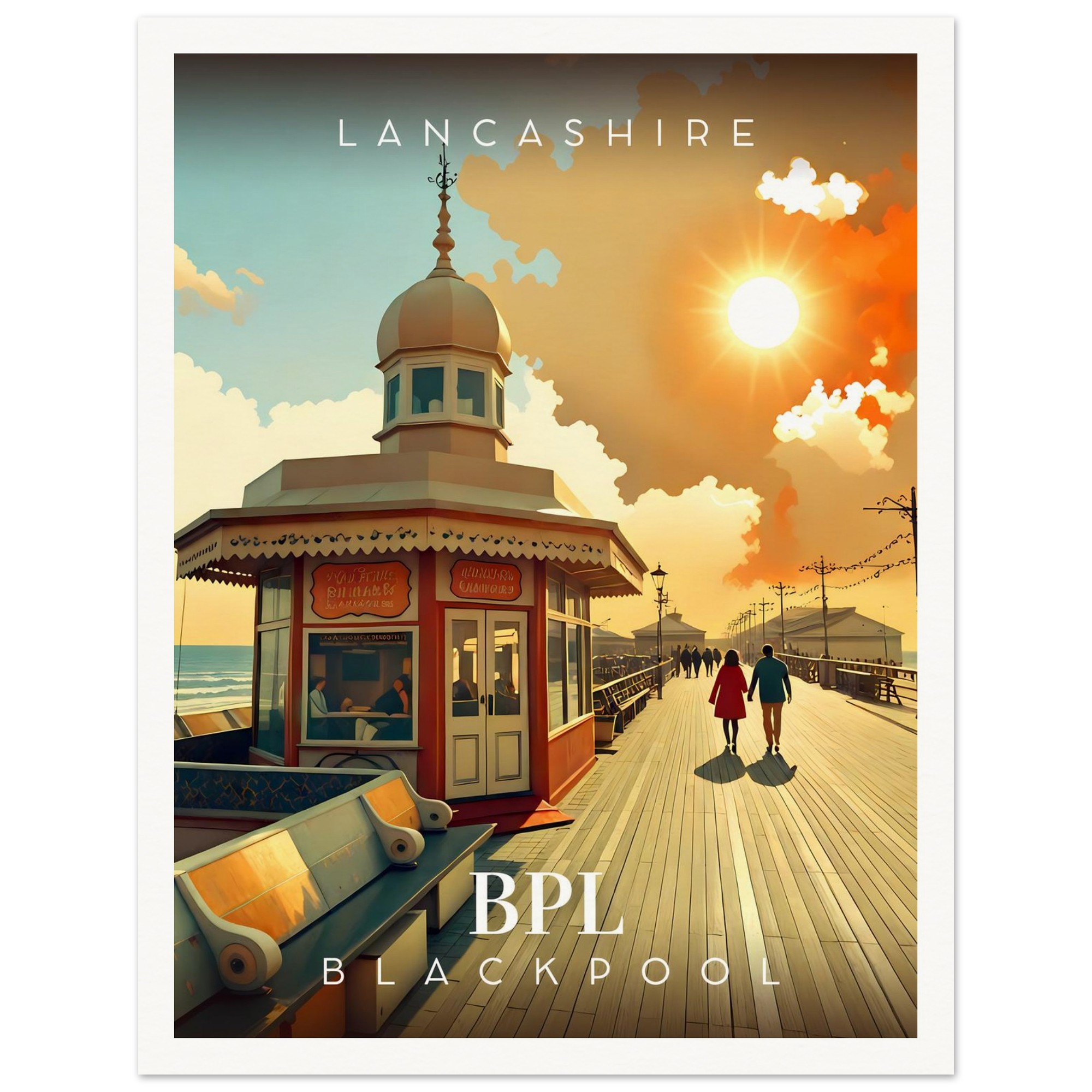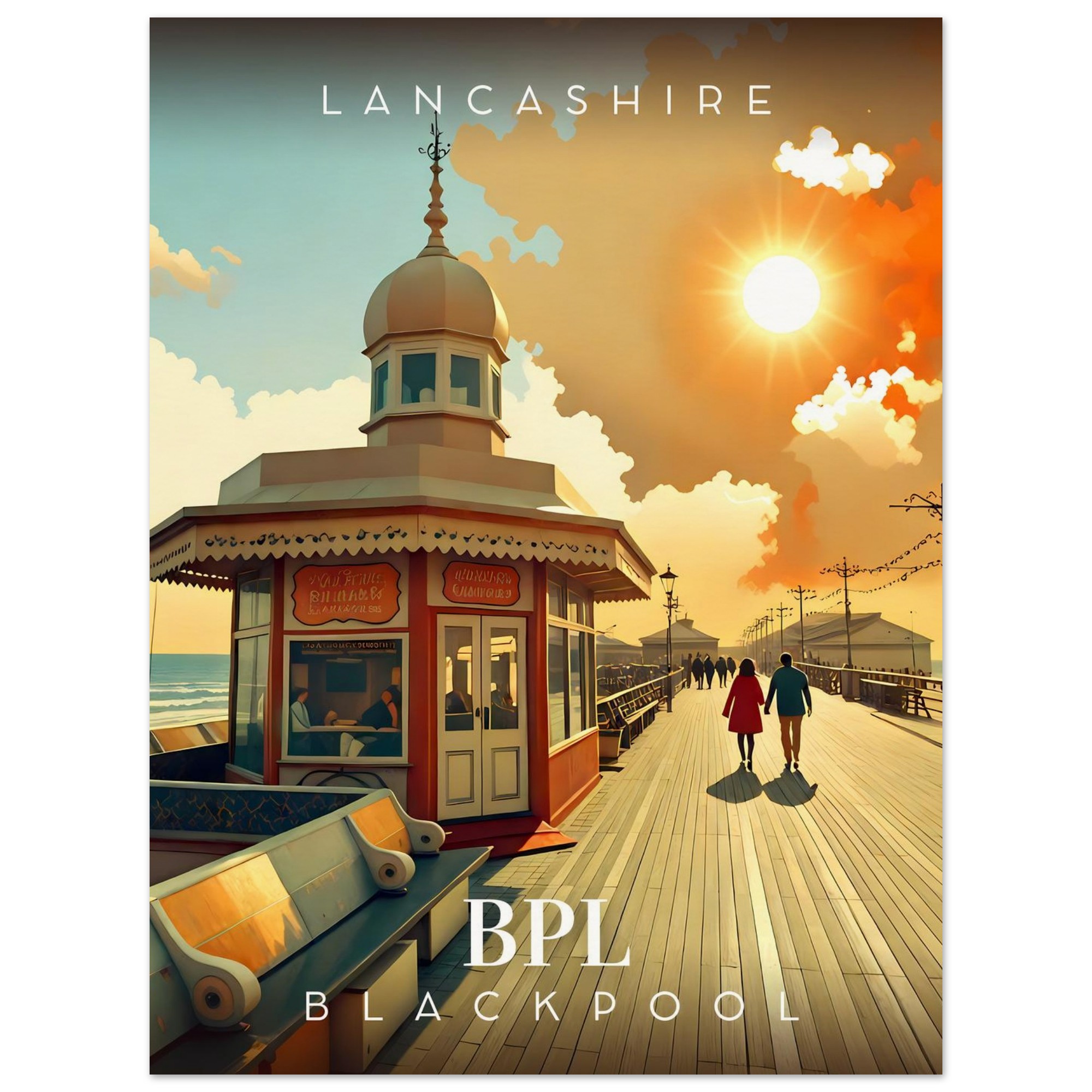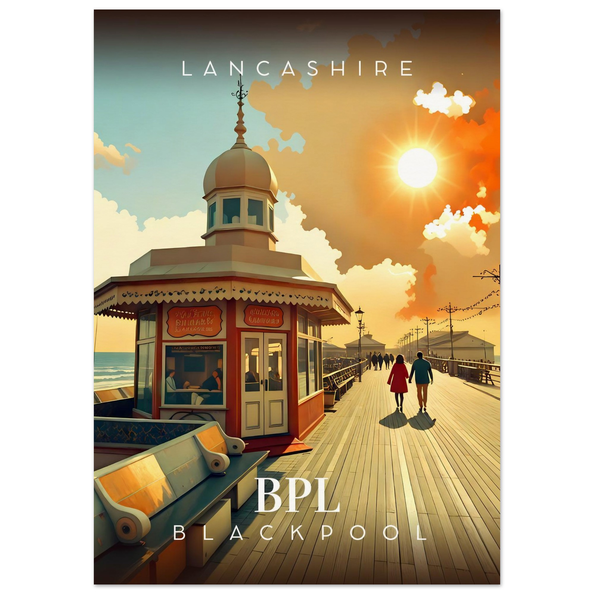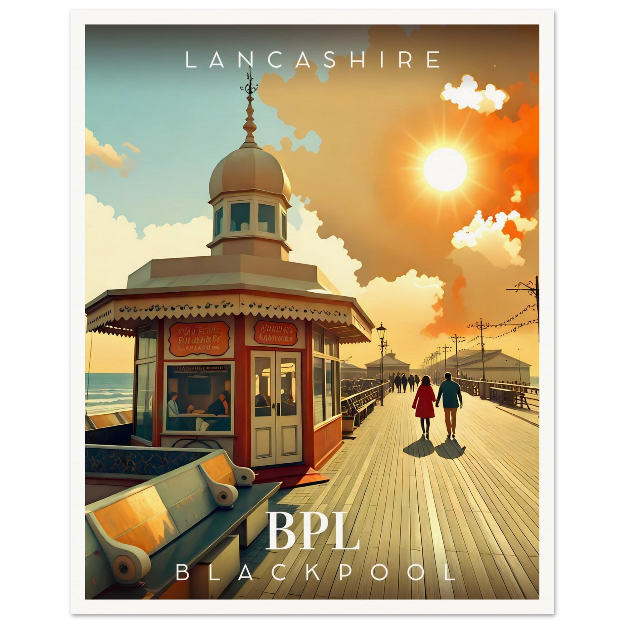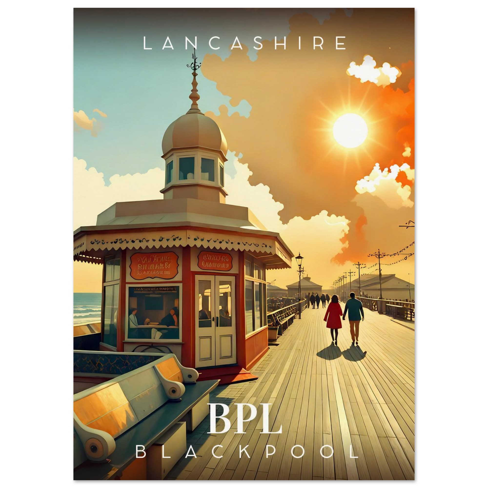 Transport yourself to the nostalgic charm of Lancashire with our stunning Retro Inspired Travel Poster featuring the iconic Blackpool North Pier. This eye-catching piece is perfect for anyone who cherishes the carefree days of seaside adventures and would make a wonderful addition to your home or office decor.