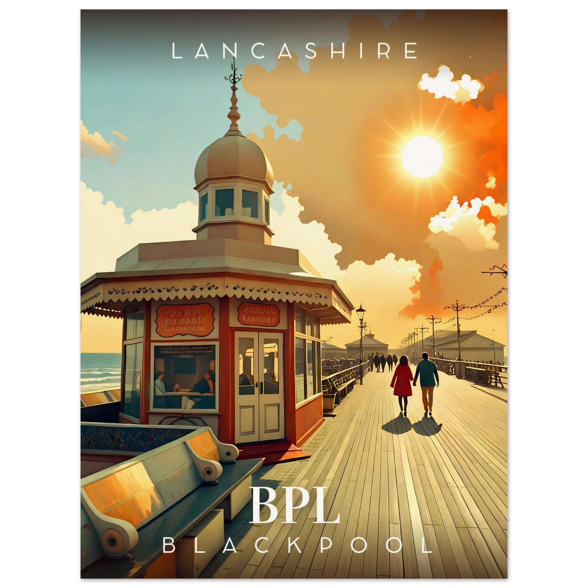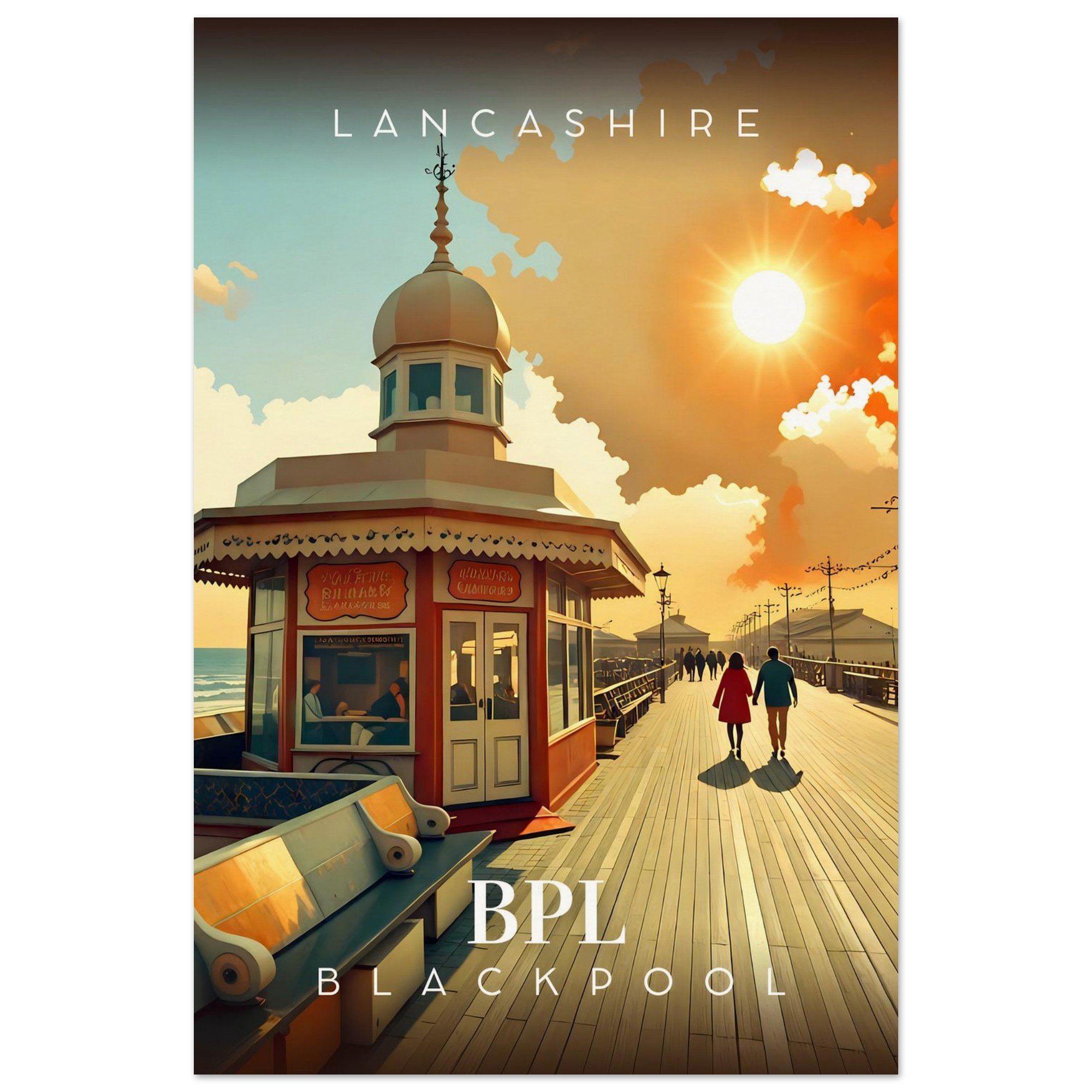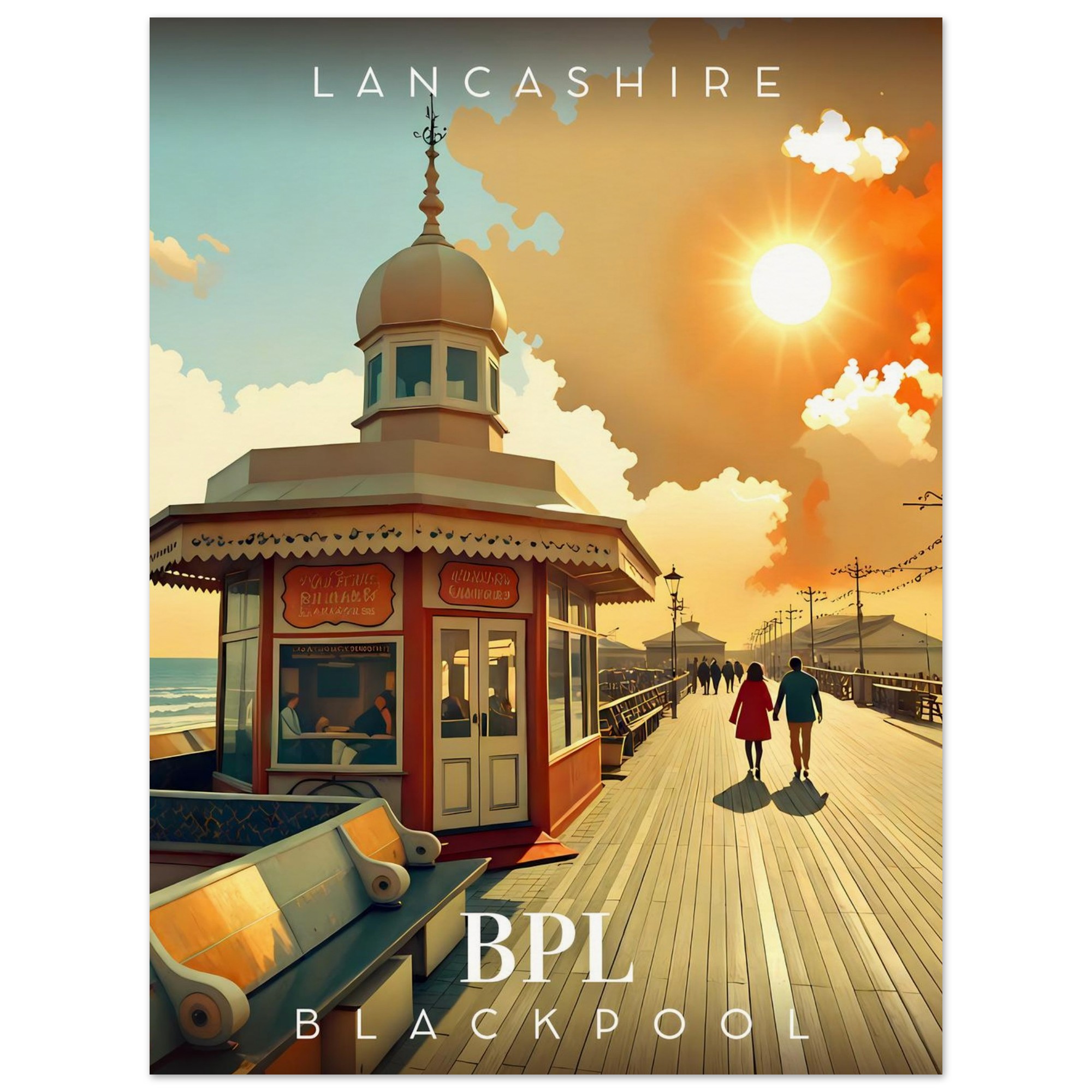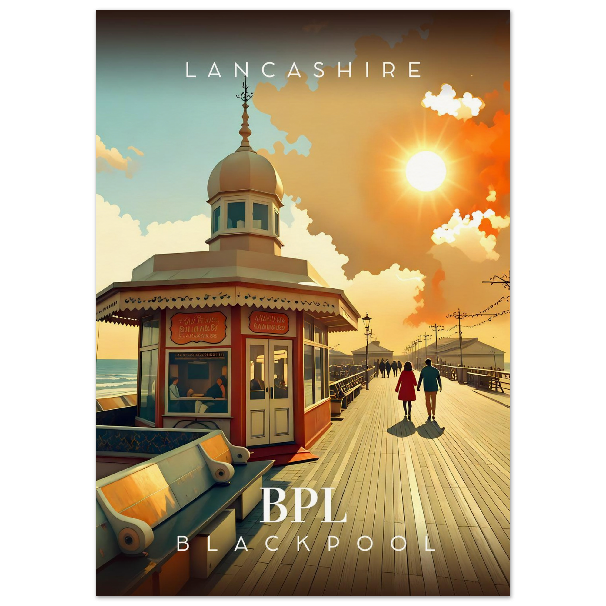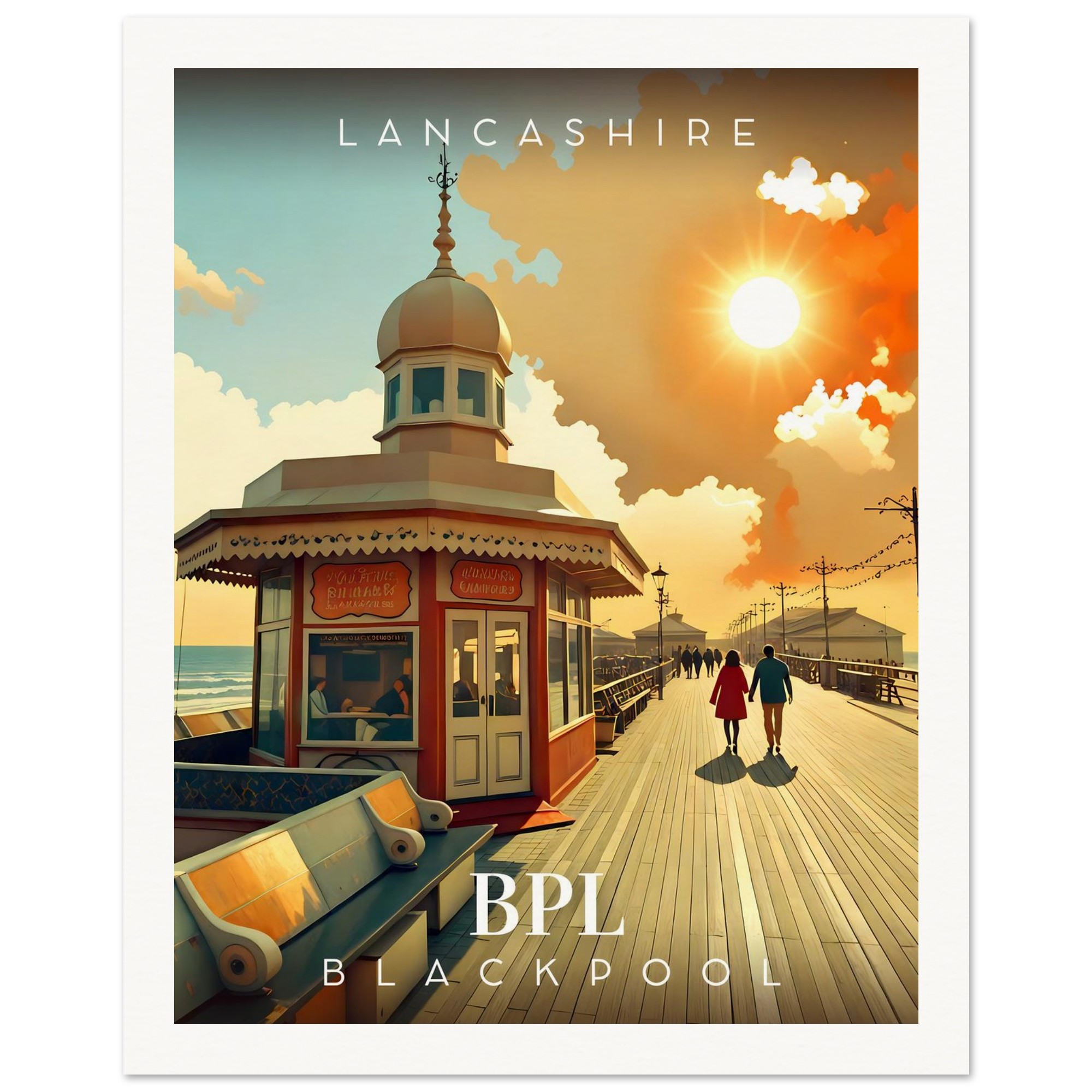 Transport yourself to the nostalgic charm of Lancashire with our stunning Retro Inspired Travel Poster featuring the iconic Blackpool North Pier. This eye-catching piece is perfect for anyone who cherishes the carefree days of seaside adventures and would make a wonderful addition to your home or office decor.