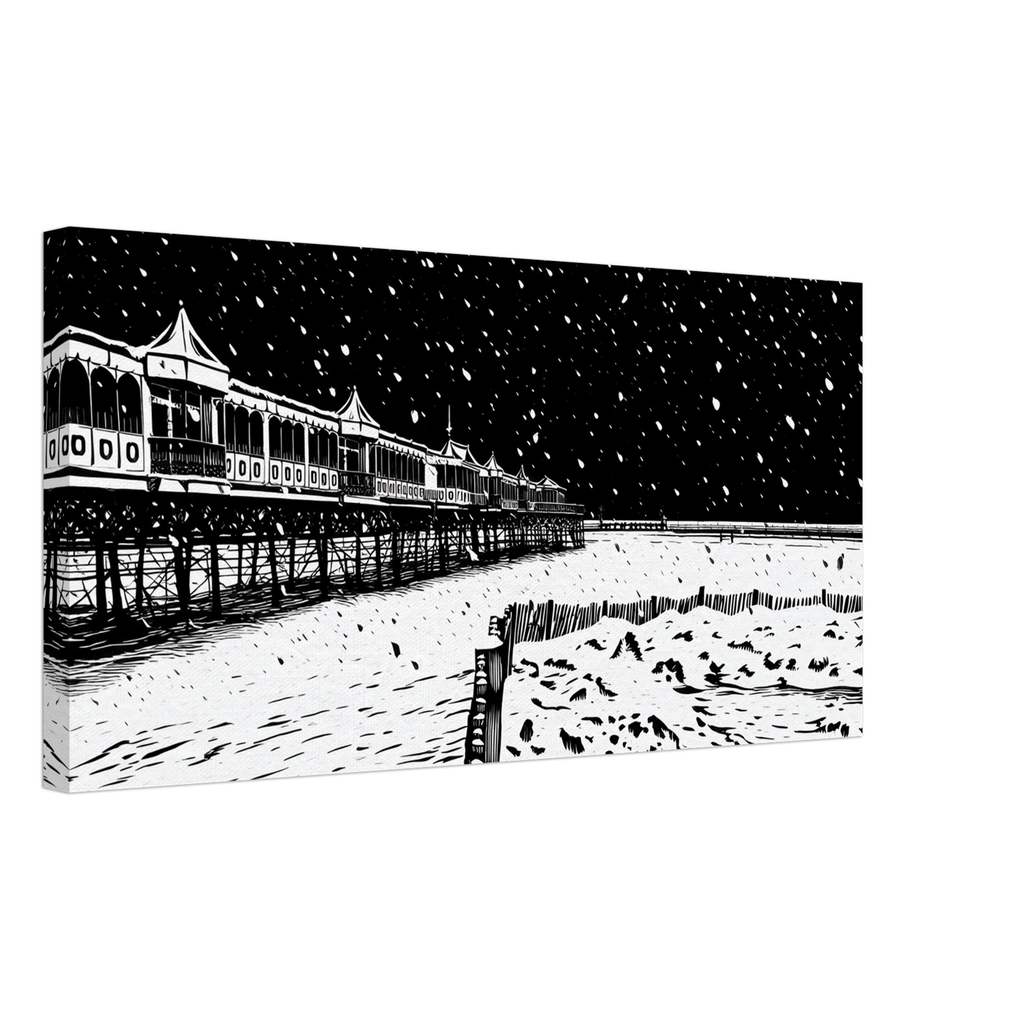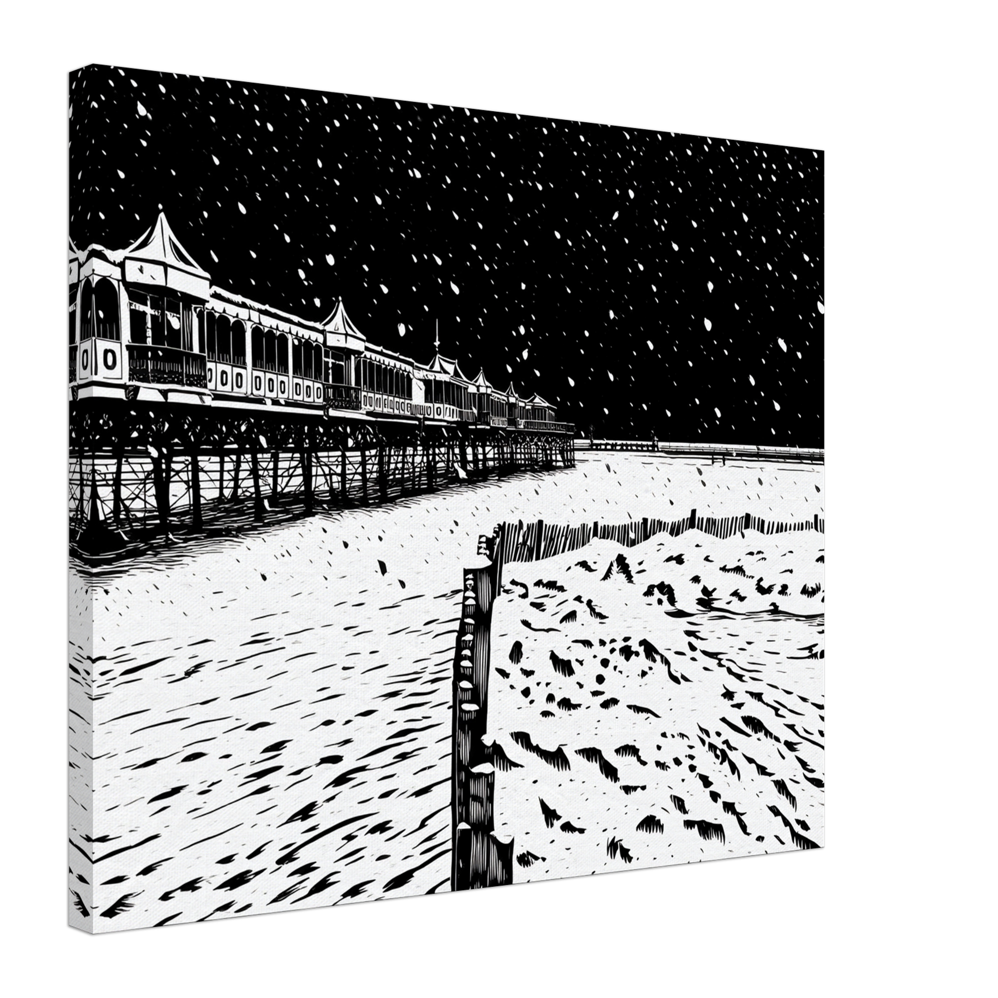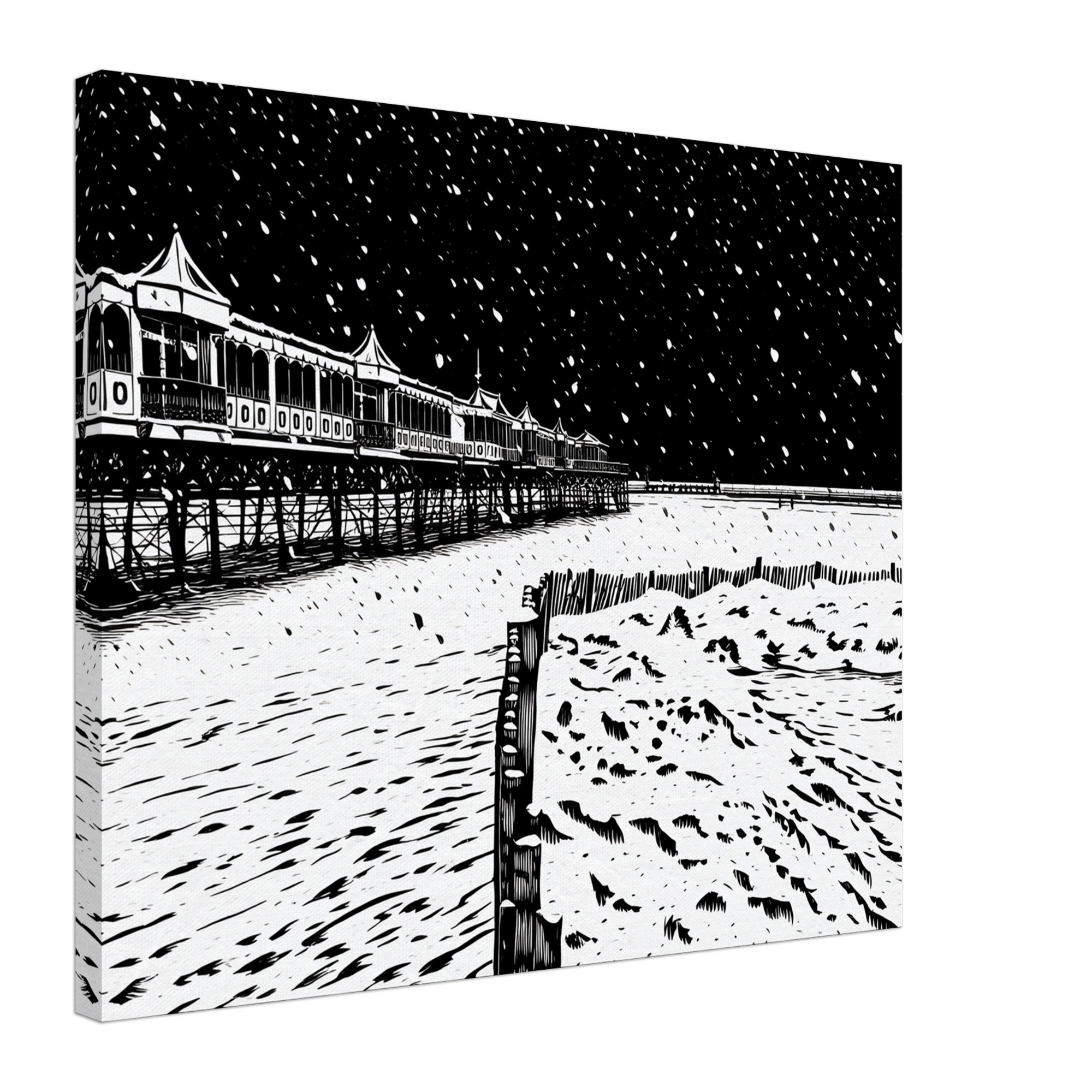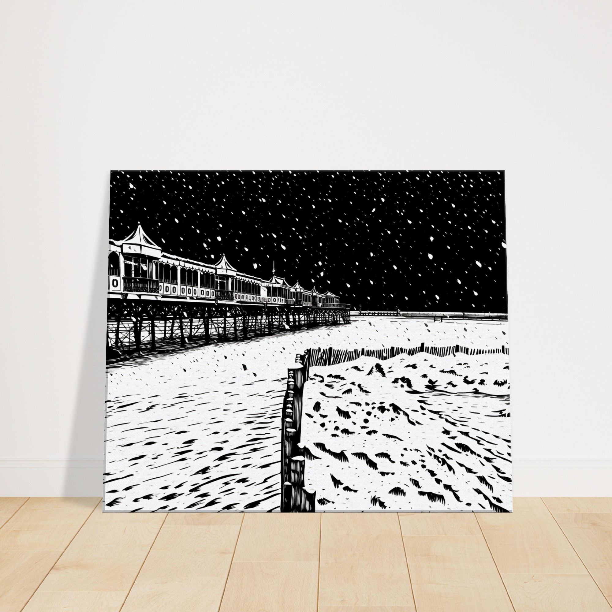 Transform your living space with our exquisite canvas print featuring the serene beauty of St Annes Pier, Lancashire, blanketed in snow. This stunning black and white woodcut-style artwork evokes a timeless, classic look that resonates with both art connoisseurs and those simply looking to add a touch of elegance to their home. The enhanced texture of the canvas brings the image to life, making it a true centerpiece in any room.