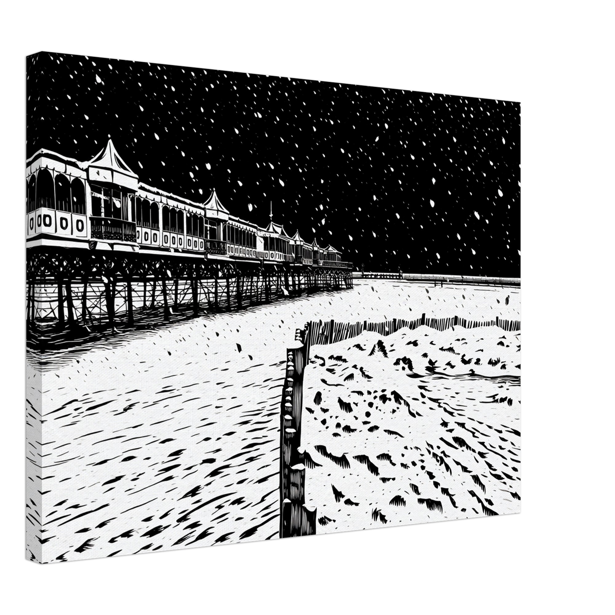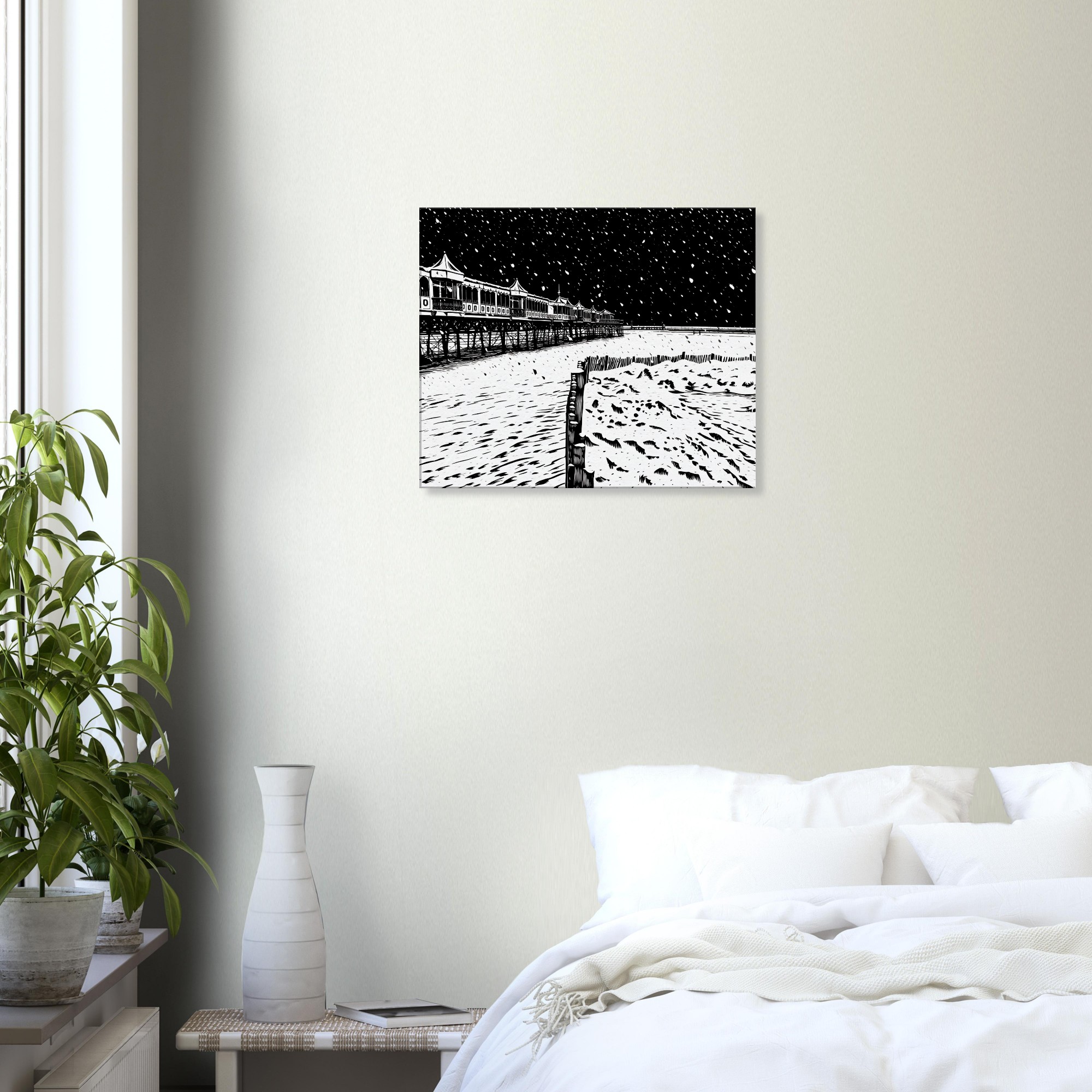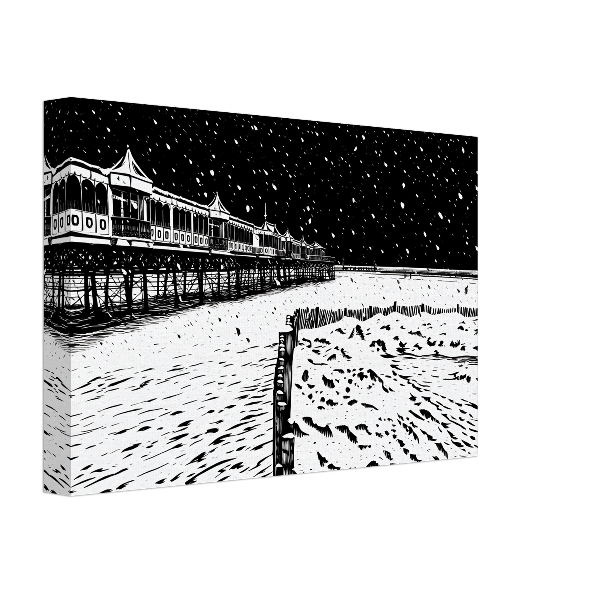 Transform your living space with our exquisite canvas print featuring the serene beauty of St Annes Pier, Lancashire, blanketed in snow. This stunning black and white woodcut-style artwork evokes a timeless, classic look that resonates with both art connoisseurs and those simply looking to add a touch of elegance to their home. The enhanced texture of the canvas brings the image to life, making it a true centerpiece in any room.