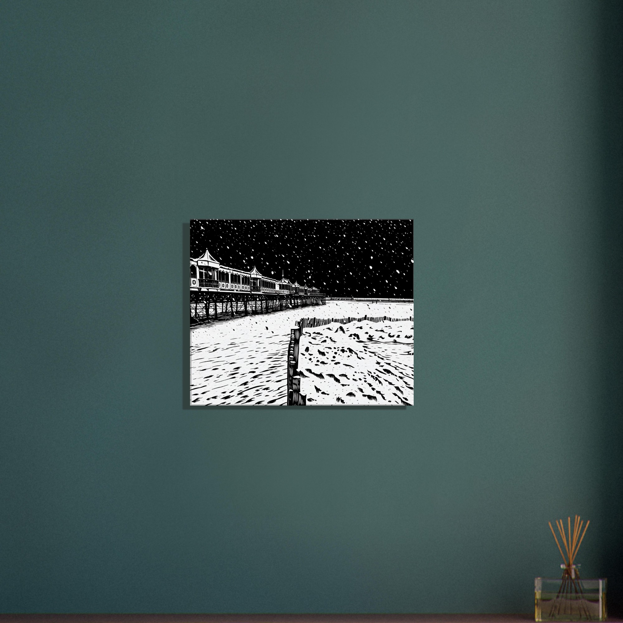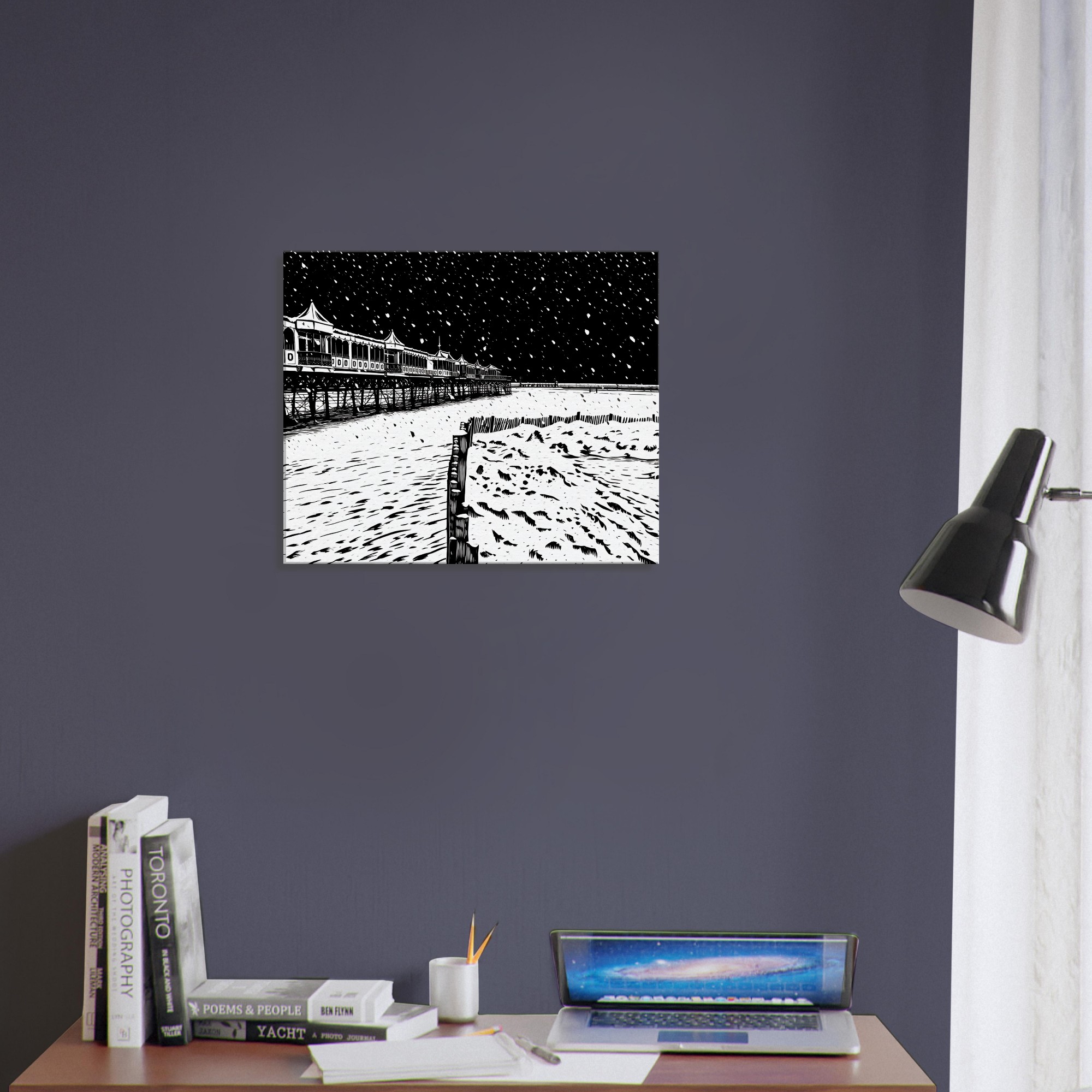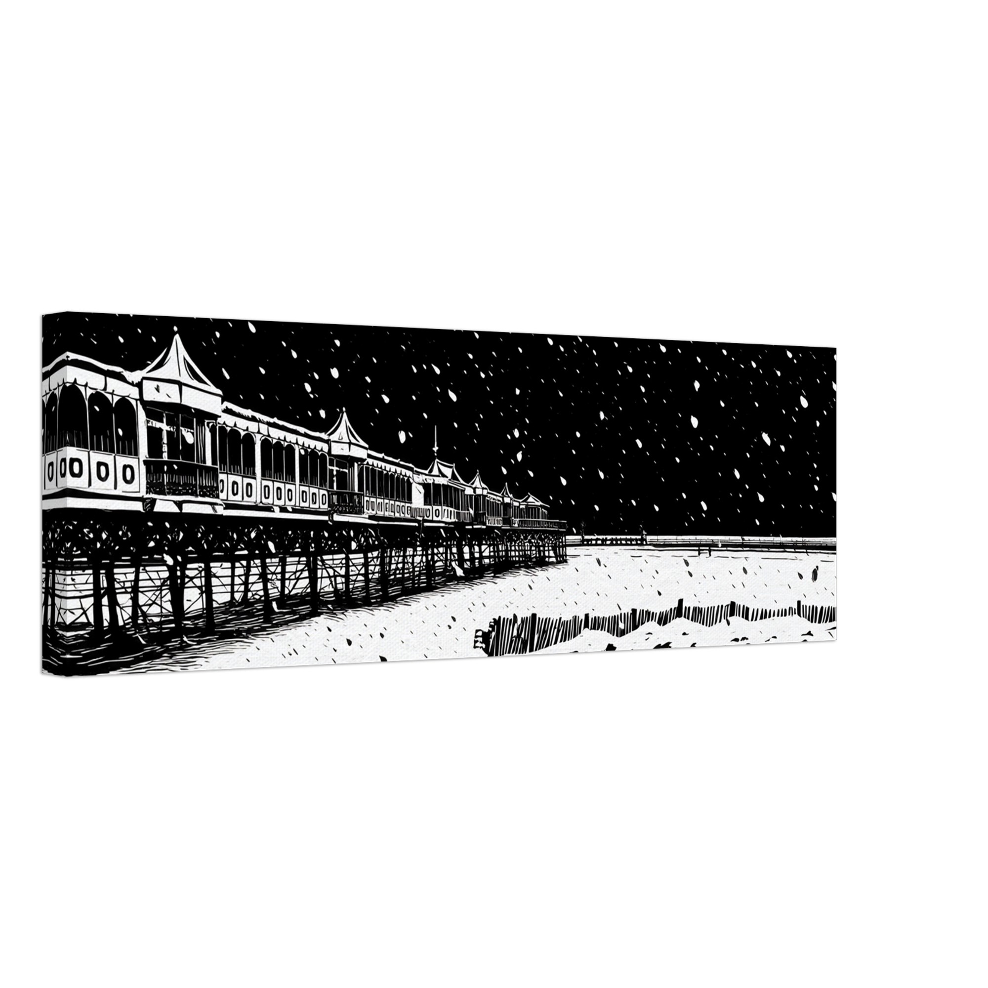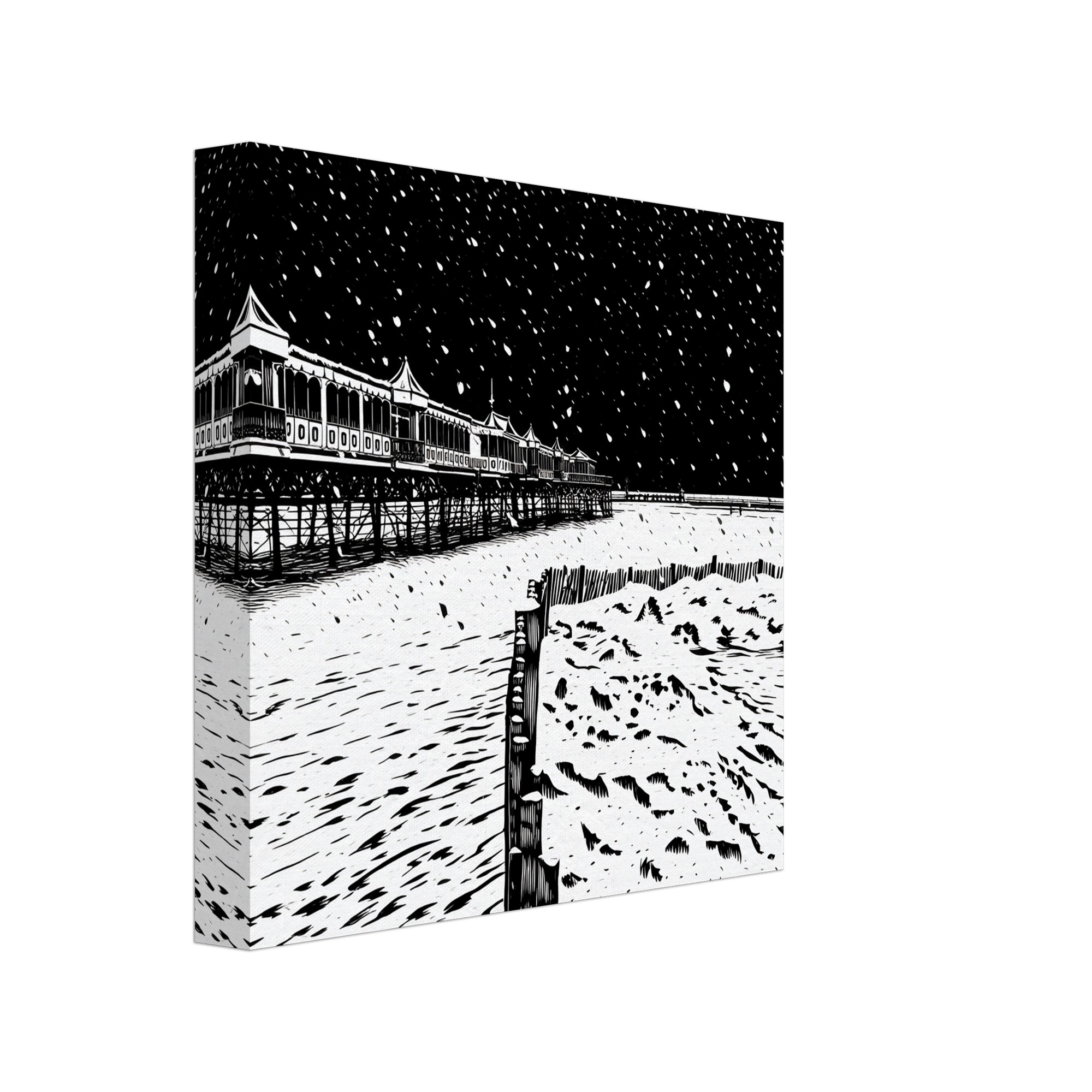 Transform your living space with our exquisite canvas print featuring the serene beauty of St Annes Pier, Lancashire, blanketed in snow. This stunning black and white woodcut-style artwork evokes a timeless, classic look that resonates with both art connoisseurs and those simply looking to add a touch of elegance to their home. The enhanced texture of the canvas brings the image to life, making it a true centerpiece in any room.